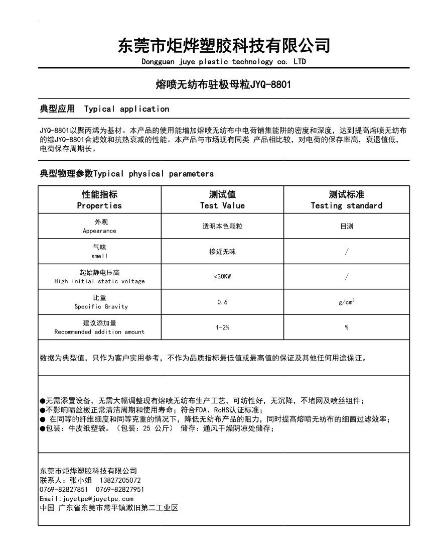 JYQ-8801以聚丙烯为基材。本产品的使用能增加熔喷无纺布中电荷铺集能阱的密度和深度,达到提高熔喷无纺布的综JYQ-8801合滤效和抗热衰减的性能。本产品与市场现有同类 产品相比较,对电荷的保存率高
